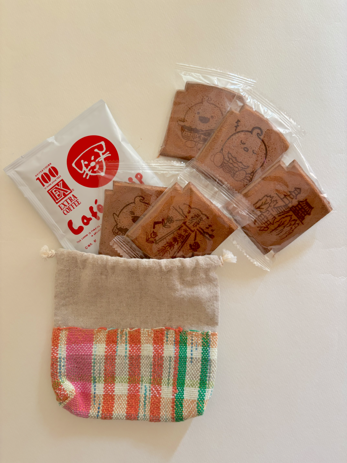 ・萌友-for youのさをり織り巾着 ・ワークホーム須磨さんの瓦せんべい ・エキストラ珈琲さんのドリップパック